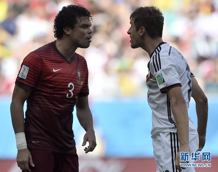 6月16日,葡萄牙队球员佩佩(左)在比赛中挑衅德国队球员托·穆勒后两人起争执。当日,在巴西萨尔瓦多新水源竞技场进行的2014年巴西世界杯小组赛G组比赛中,德国队对阵葡萄牙队。 新华社记者戚恒摄