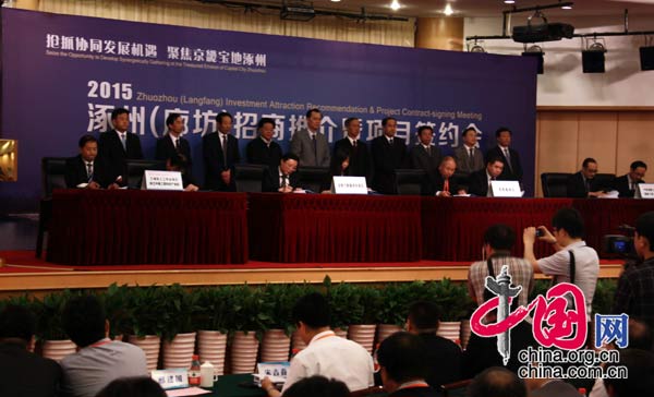 2015年,涿州市列入全省重点前期项目3项,分别为京冀协同长安(涿州)产业园、京能热电联产一期项目和中国农业科技园。1500项10亿元以上重点项目我市共计7项,均为承接北京转移项目;此外,该市还有部分10亿元以上产业项目,包括已经签订框架协议或正在深入推进的总投资30亿元的华融金融中心项目、总投资16.5亿元的歌华有线智慧云项目、总投资300亿元的众美健康养老产业示范区项目、总投资15亿元的清华科技园启迪园项目。