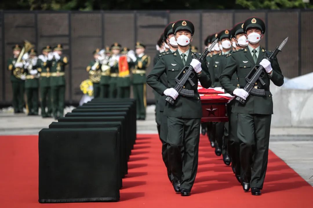 88名礼兵护送着志愿军烈士棺椁,缓缓步入现场。全场奏唱中华人民共和国国歌。国歌唱毕,人们垂首默哀,现场庄严肃穆。