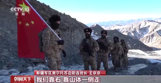 新疆军区奥尔托苏边防连班长 王京京:大家停一下,前方路面结冰,我们靠右,靠山体一侧走,避免滑倒。