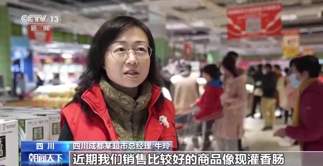 四川成都某超市总经理 牛玲:近期我们销售比较好的商品像现灌香肠,同时预制菜肴消费趋势明显提升。我们准备了超万支年货商品,主要以食品为主供顾客挑选。