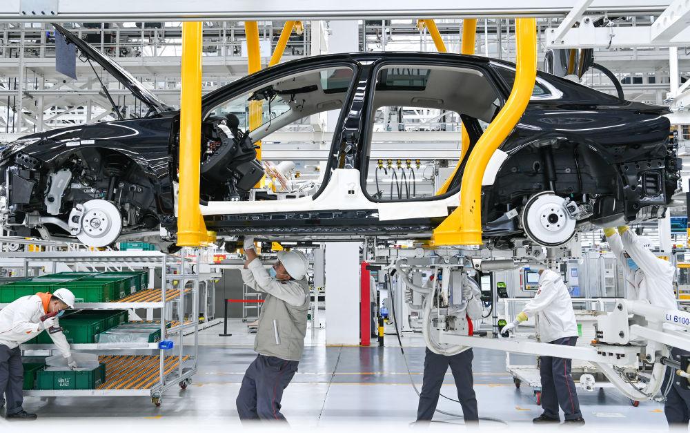 在吉林省长春市中国第一汽车集团有限公司红旗繁荣工厂,工人在总装车间的生产线上装配车辆(2022年10月17日摄)。新华社记者 颜麟蕴 摄