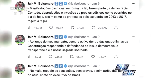 而1月8日当天,博索纳罗在推特发文回应,指责这类行为超越了民主界限。不过,博索纳罗也驳斥了他应该对骚乱负责的说法。他坚称在自己的整个任期内,始终按照宪法行事。