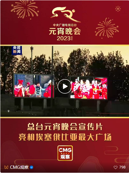 位于埃塞俄比亚首都亚的斯亚贝巴市中心的梅斯克尔广场的大屏幕也再次亮起中国红,五块LED大屏幕循环播放元宵晚会宣传片,引发在场民众的关注。