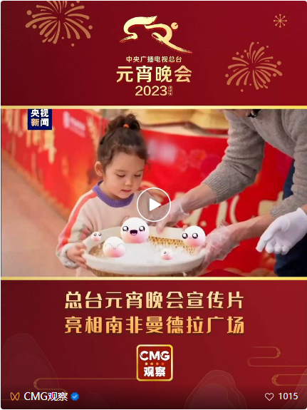 当地时间2月3日,总台元宵晚会宣传片在南非第一大城市约翰内斯堡地标建筑曼德拉广场精彩亮相,这是总台元宵晚会相关内容首次在南非公共空间播放。