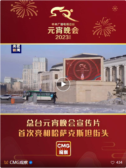 2月3日至2月6日,总台元宵晚会宣传片亮相哈萨克斯坦首都阿斯塔纳市,在市中心最大商场“可汗之帐”附近、“克鲁因”购物中心内、多斯特克路、阿斯塔纳歌剧院和科纳耶夫路等繁华地带和街区的10块大屏幕上,全天24小时滚动播出,集中向阿斯塔纳市民展示总台元宵晚会。