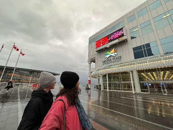 当地时间2月3日,总台元宵晚会海报在温哥华地标建筑加拿大广场(Canada Place)的大屏幕播放。海报内容现代喜庆,来往游客驻足观看,这是总台元宵晚会海报首次亮相加拿大地标建筑。