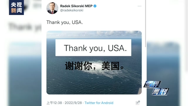 去年9月27日,也就是“北溪”管道发生爆炸泄漏第二天,波兰前外长西科尔斯基在社交媒体转发了一条配有“北溪”管道事故现场图的推文,并附上了这样一句话:“谢谢你,美国。”