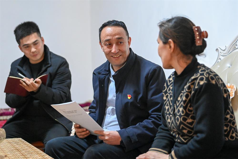 2月20日,新疆和田地区策勒县巴什玉吉买村党支部书记买买提依布热依木·买买提明(中)在村民家走访。新华社记者 丁磊 摄