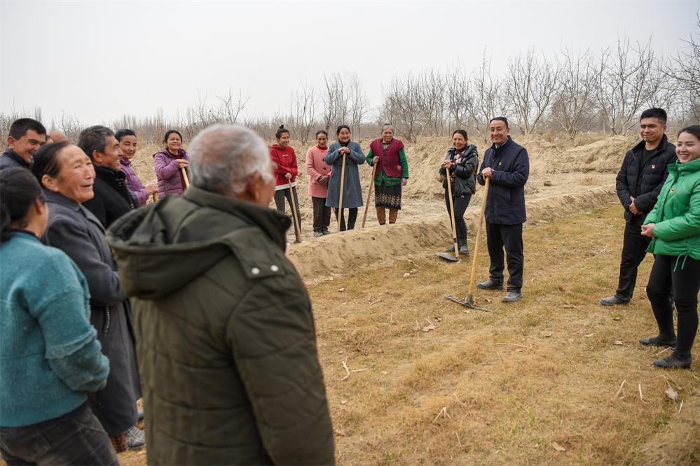 2月20日,在新疆和田地区策勒县巴什玉吉买村,买买提依布热依木·买买提明(中)和村民一起整理土地,为春耕生产做准备。新华社记者 丁磊 摄