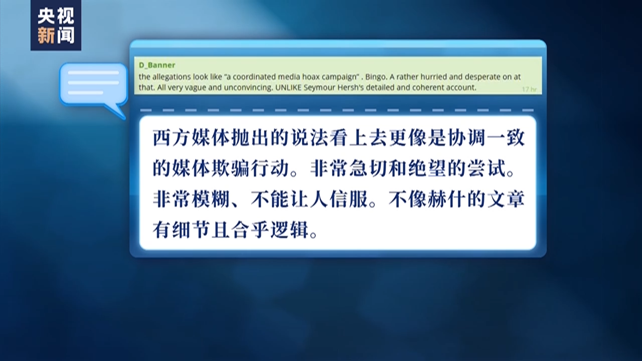 “西方媒体抛出的说法看上去更像是协调一致的媒体欺骗行动。非常急切和绝望的尝试。非常模糊、不能让人信服。不像赫什的文章有细节且合乎逻辑。”
