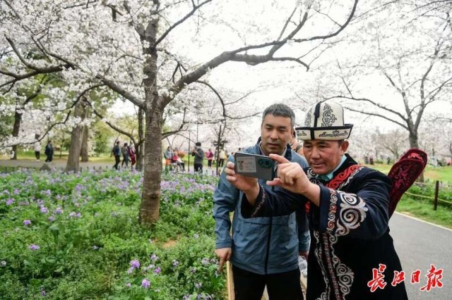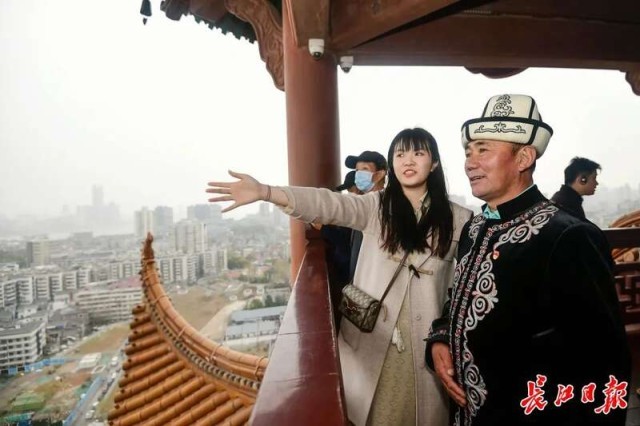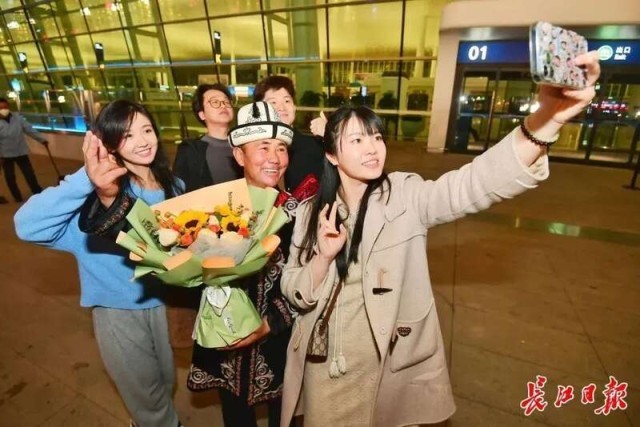 曾受助的武汉游客与新疆牧民大叔阿布都加帕尔·猛德在天河机场合影。