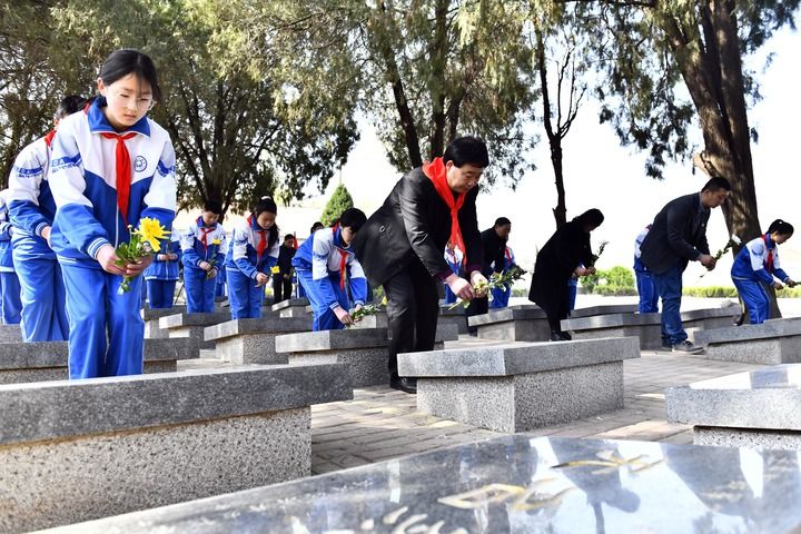 3月29日,在山东省菏泽市鲁西新区张和庄烈士陵园,张景宪(前排左二)和刘庙小学的师生为无名烈士献花。新华社记者 郭绪雷 摄
