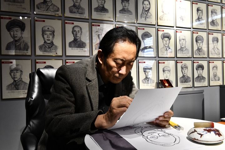 林宇辉从山东省公安机关退休后,2018年发起“为百名革命烈士免费画像”的公益计划,如今已完成159幅。每天,他都会接到各地烈属的求助。打电话、通视频、看照片、查资料……根据对烈士的描述,林宇辉绘出了一幅幅英烈面孔。