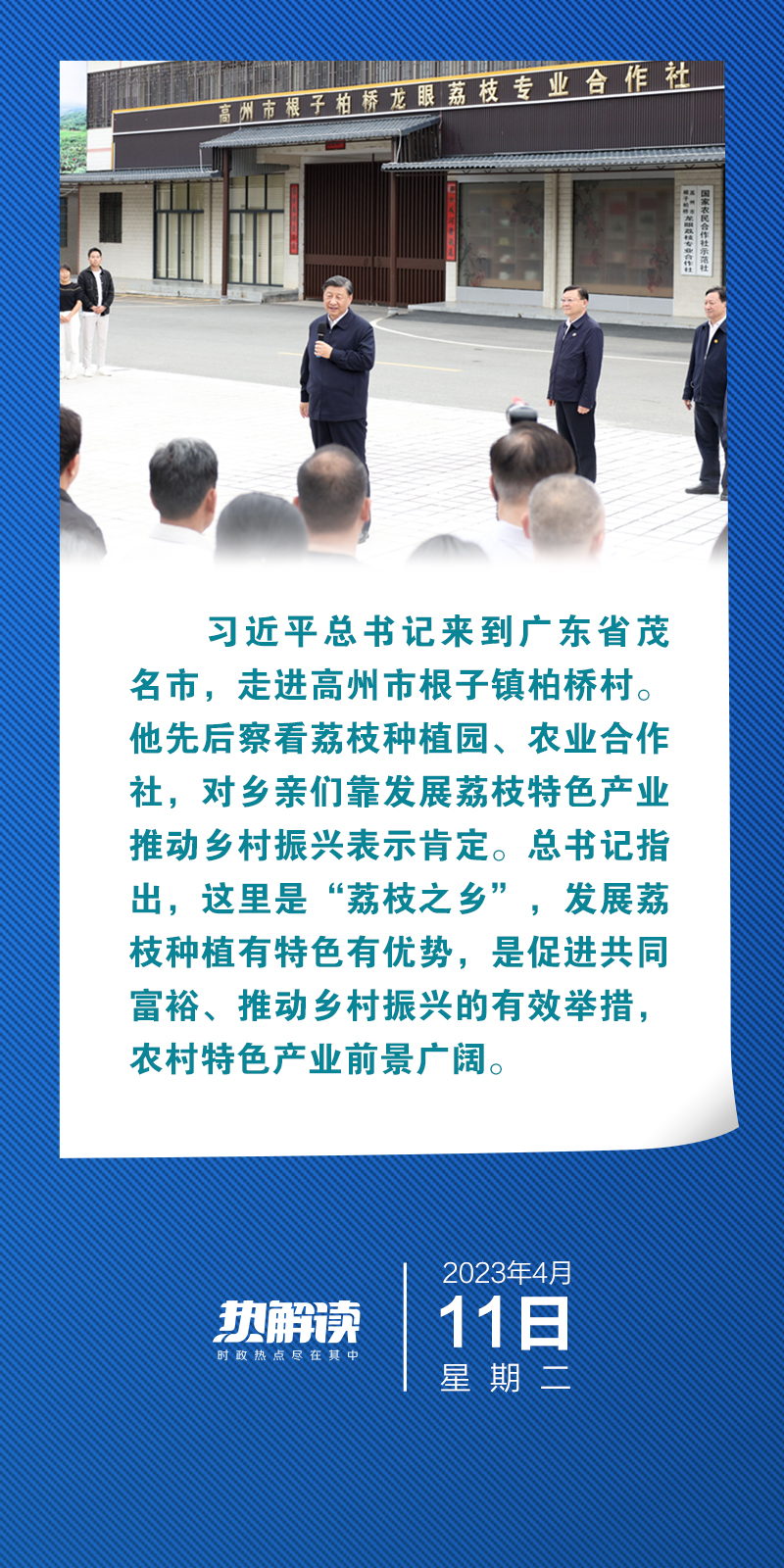 热解读4月11日,广东之行第二天,习近平总书记来到茂名市高州市根子镇柏桥村。该村有着2000余年荔枝种植历史,村内的贡园,更是目前全国面积最大、历史最悠久、品种最齐全的古荔园之一,享有“荔枝博物馆”的美誉。