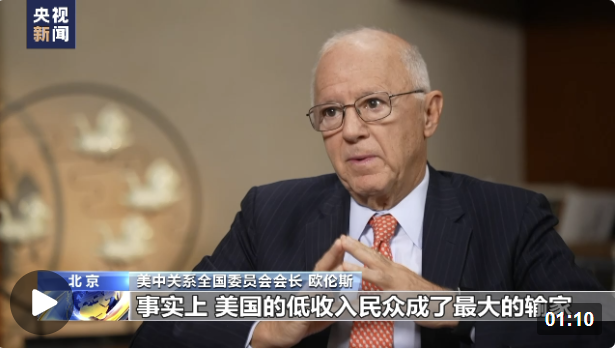 美中关系全国委员会会长 欧伦斯:以关税为例,究竟谁会从上届美国政府加征的关税中获利?事实上,美国的低收入民众成了最大的输家。我们估算这些关税使每个美国家庭每年损失约1000美元,你不得不在别的地方省钱,不再给孩子买鞋子、裤子、衬衫或学校课本。