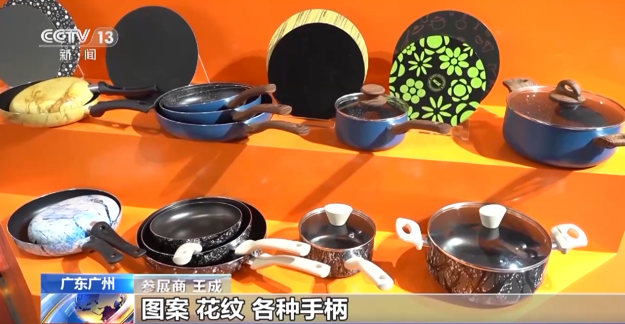参展商 王成:图案、花纹、各种手柄,以及我们锅具的底部的各种处理,其实都是可以根据客户的一些需求来进行定制。最快速度25天可以完成交货。