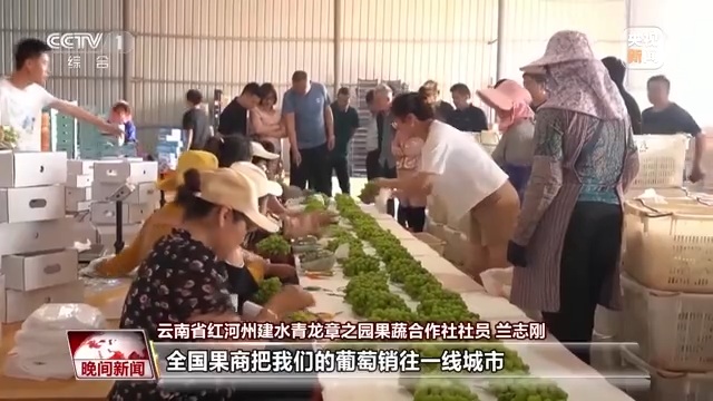 云南省红河州建水青龙章之园果蔬合作社社员 兰志刚:今年是个丰收年,果商定的价格是105元每公斤,全国果商把我们的葡萄销往一线城市,北上广深都有。