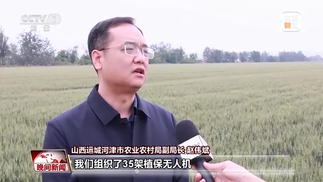 山西运城河津市农业农村局副局长 赵伟斌:为了保障今年粮食安全,我们组织了35架植保无人机和70余名工作人员,对全市24万亩小麦进行全覆盖施工喷防作业。