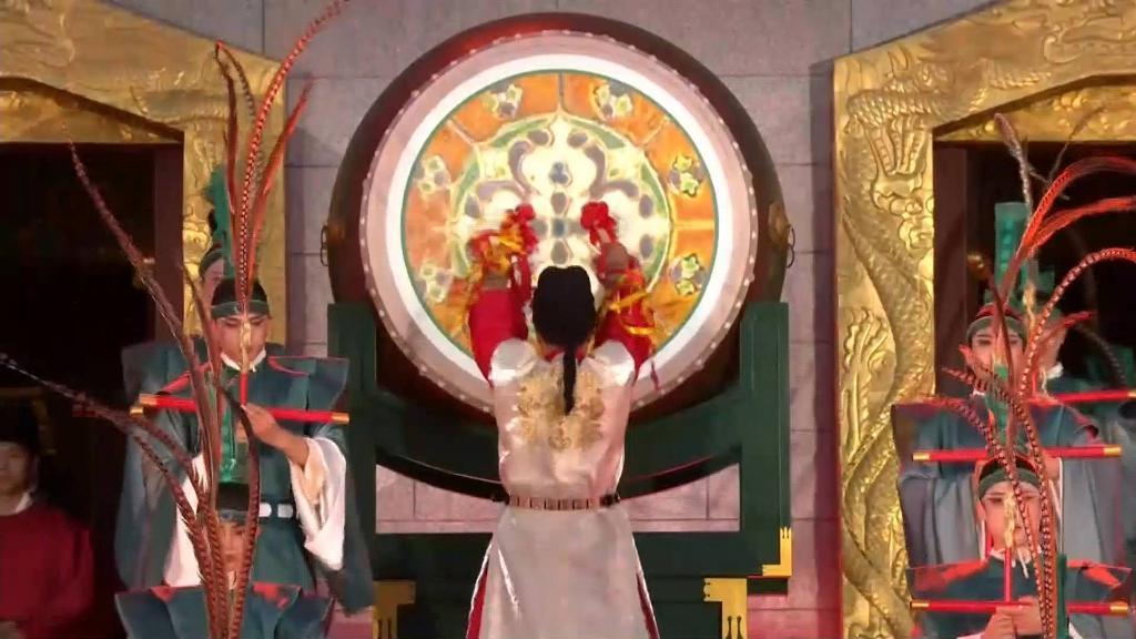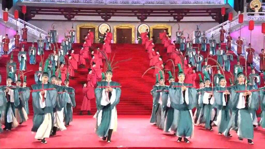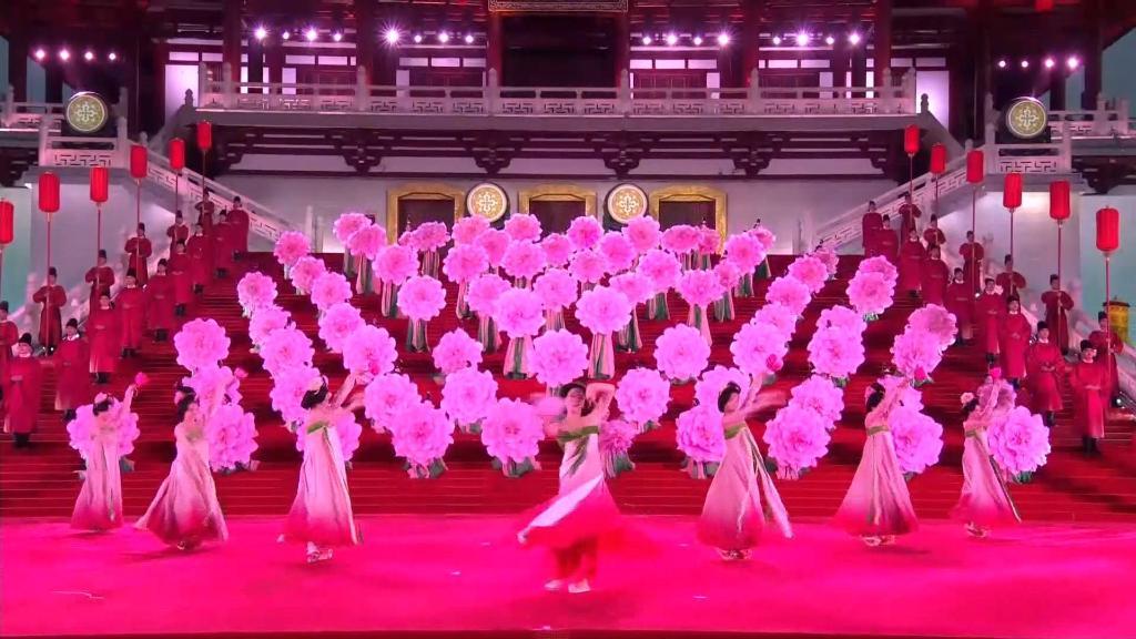 紫云楼前,礼乐和鸣,明快有力的古代佾舞、绚丽婀娜的芙蓉花舞,表达了古都西安人民的热情好客,体现了中华文化兼容并蓄的精神风貌。