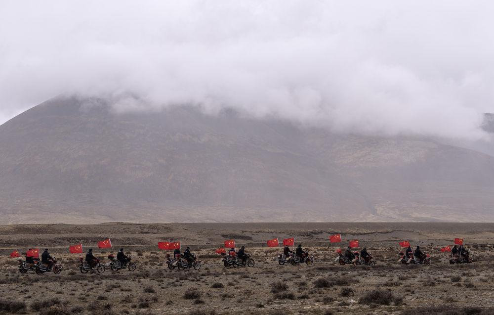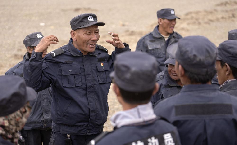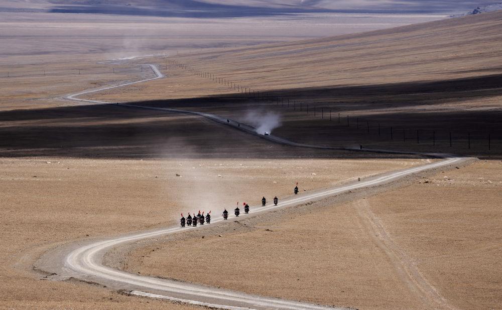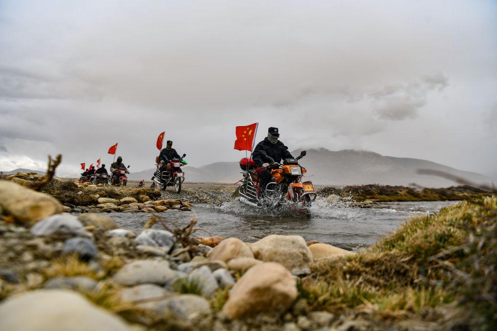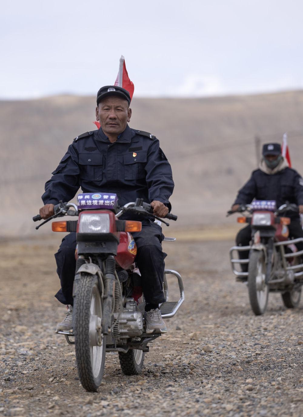 这里是平均海拔超过5000米的西藏日喀则市萨嘎县昌果乡,虽然已是初夏时节,但依然是寒风刺骨。50岁的昌果护边联防队队长石角带领18名队员,骑着摩托车在边境线巡逻。