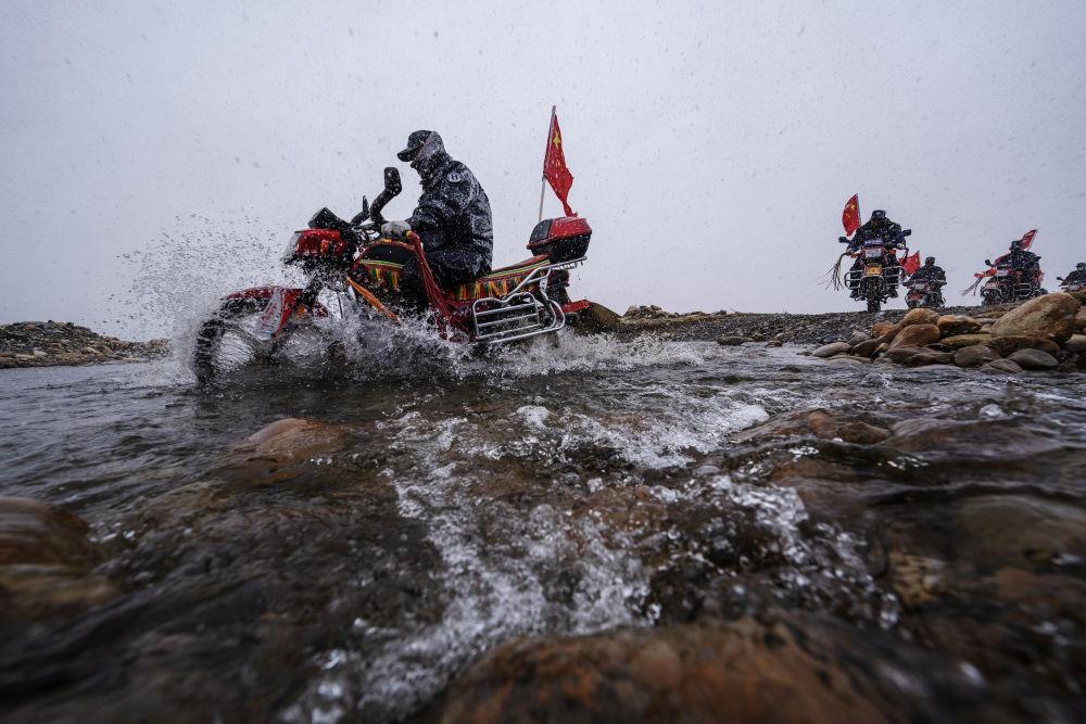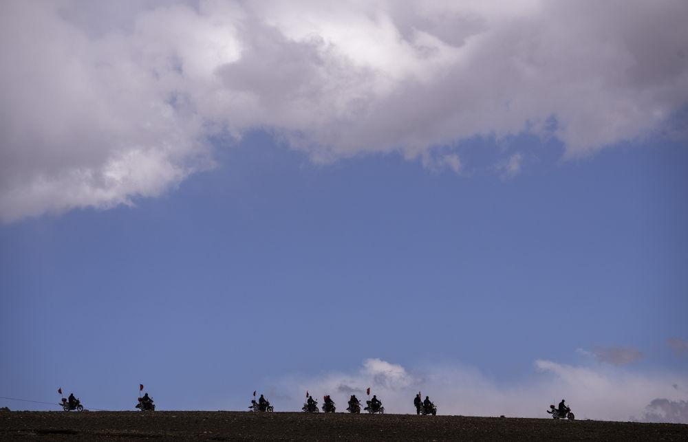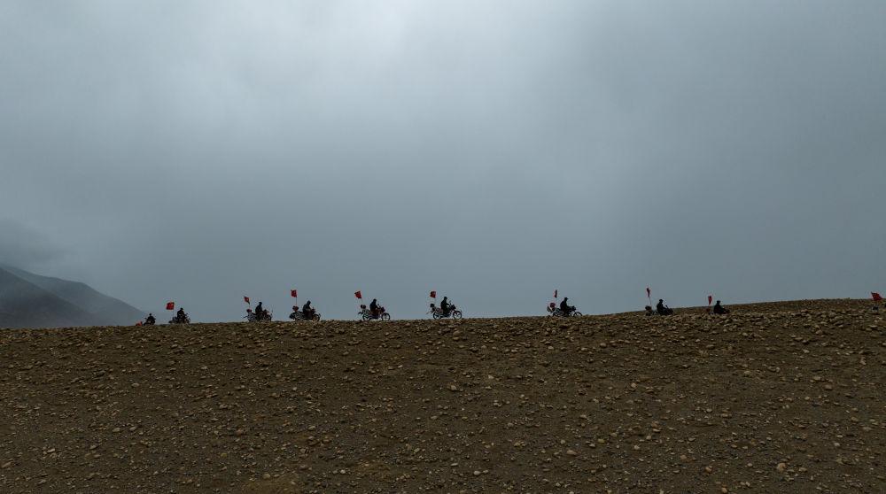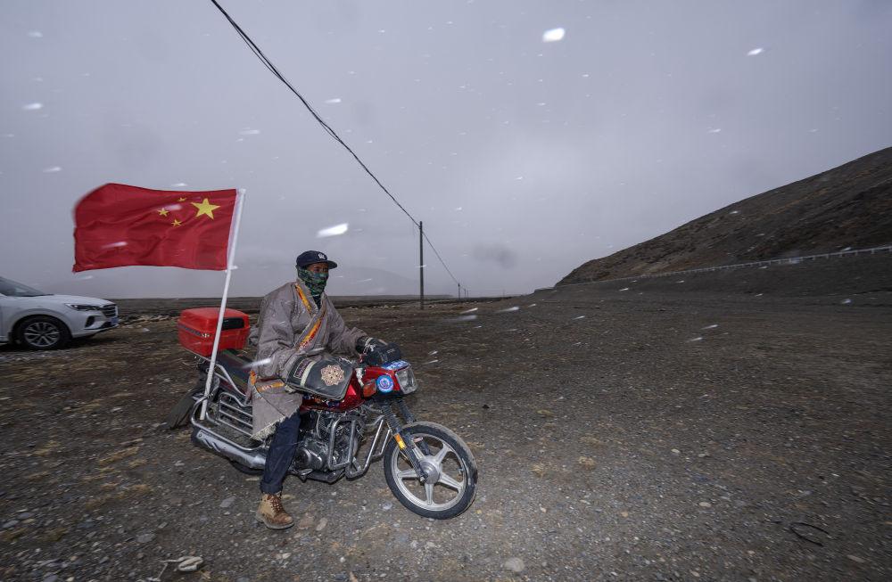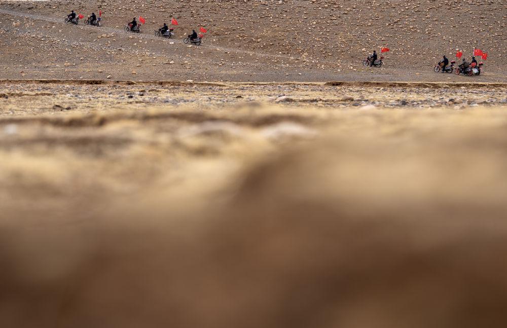 这里是平均海拔超过5000米的西藏日喀则市萨嘎县昌果乡,虽然已是初夏时节,但依然是寒风刺骨。50岁的昌果护边联防队队长石角带领18名队员,骑着摩托车在边境线巡逻。