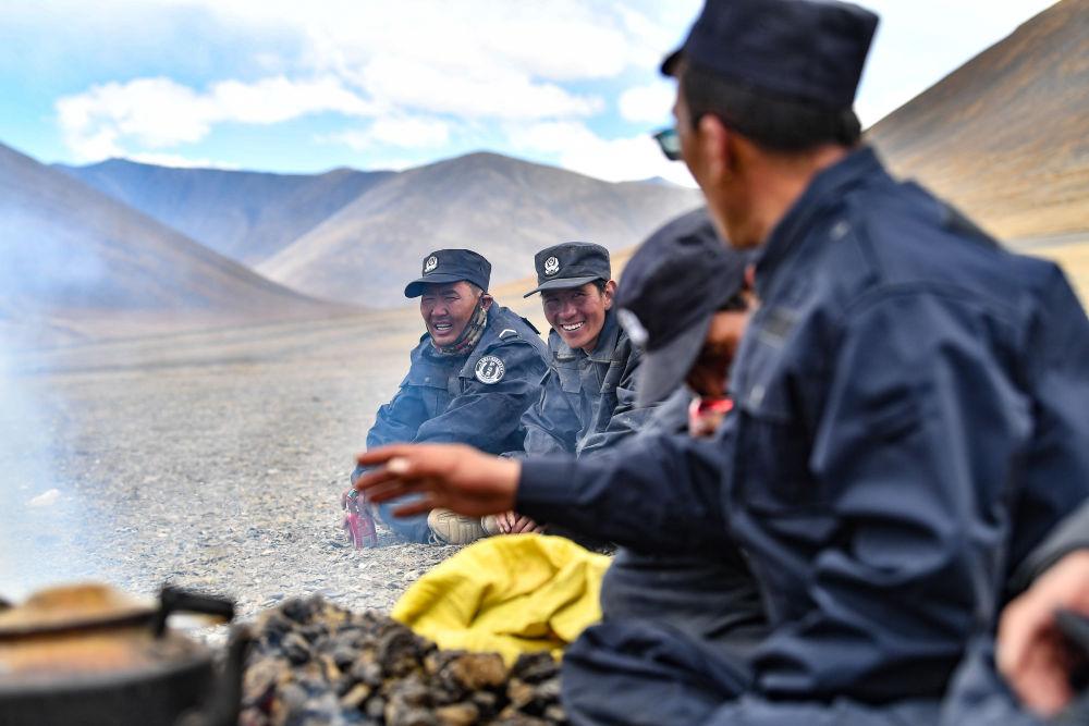 33号界桩所在的山口,风大得惊人,记者估计至少有9—10级,本来就是5000米左右的海拔,狂风一吹,感觉口鼻附近的氧气全给吹跑了,眼泪不停地流,不一会儿,操作相机的手也变得僵硬。石角和他的伙伴们却对此习以为常:今天的这种天气对他们来说,并不算最艰难的,如果是严冬,在这些平均海拔超过5000多米的边境线上巡逻,寒风刮来,会让人感觉是一把锋利的锯齿刀在脸上来回刮动。石角和护边队员们首先排好队向界桩敬礼,然后围坐在一起,由石角向大家交代最近的一些巡边护边的注意事项。随后,在石角的安排下,分成几组,沿着边境线开始了巡视。