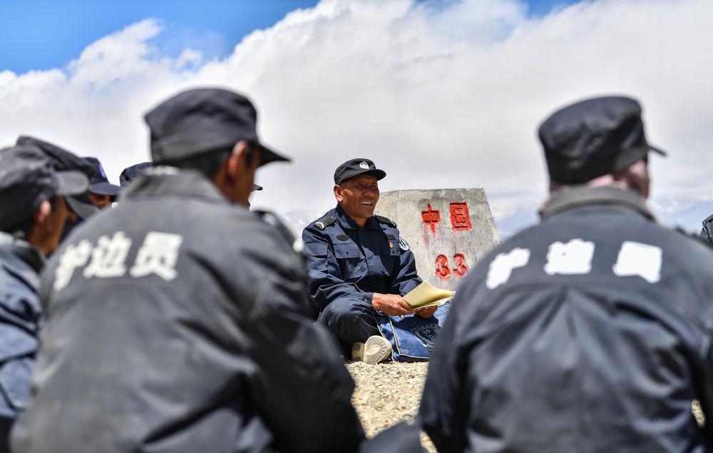 6月2日,在33号界桩处,护边联防队在队长石角(右二)的带领下学习。