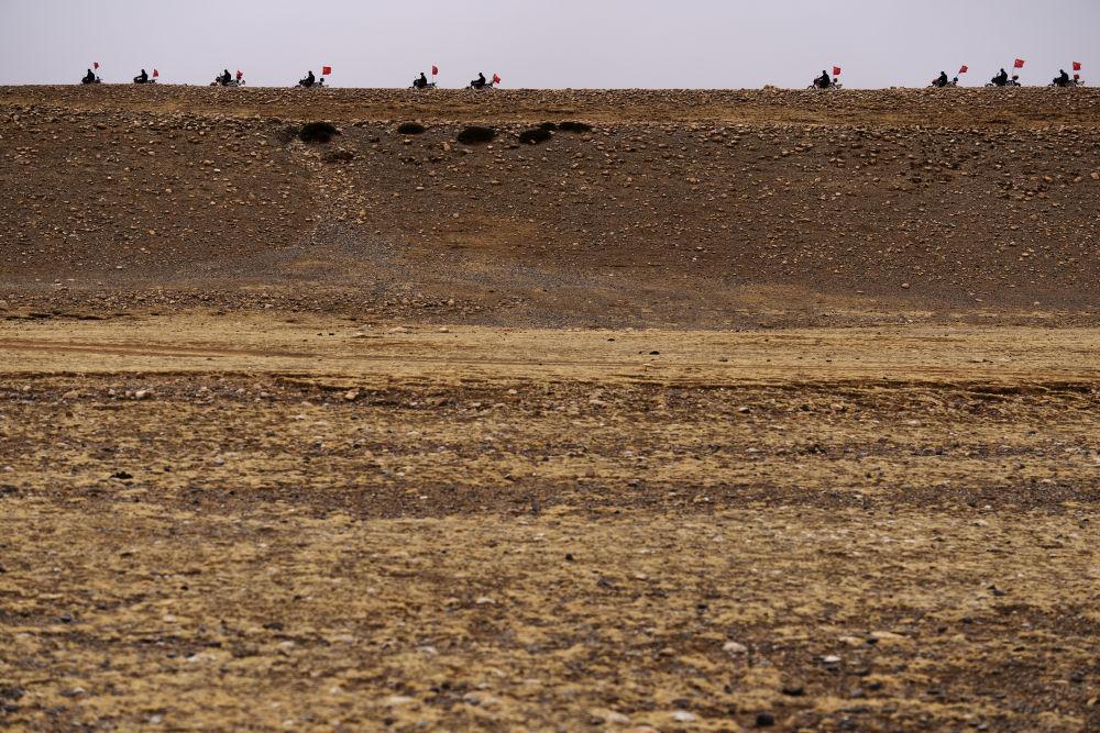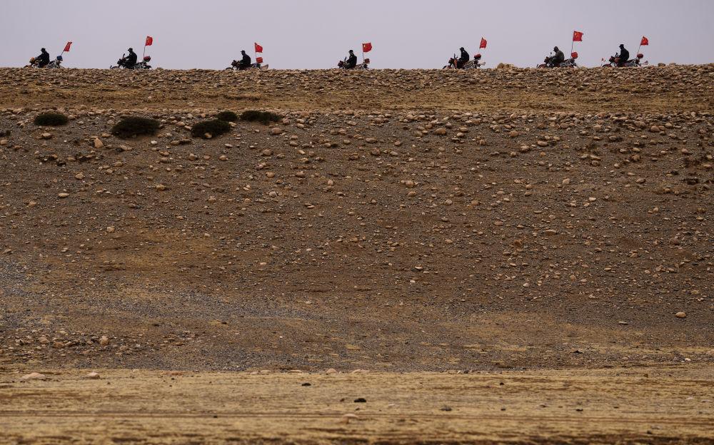 车轮滚滚,黄沙漫漫,一队摩托车风驰电掣般地驶来,在大漠中的简易公路上掀起漫天的沙尘。每一辆摩托车上都竖立着一根旗杆,上面飘扬着五星红旗,在风中,猎猎作响。