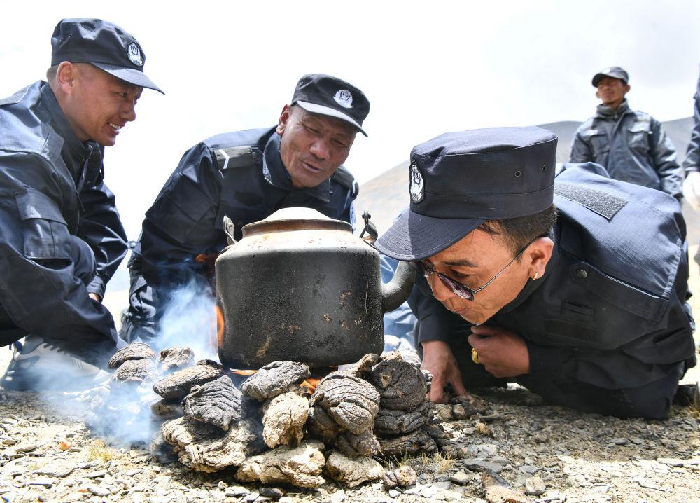 护边联防队队员在一块空地上点燃牛粪,准备午餐(6月2日摄)。