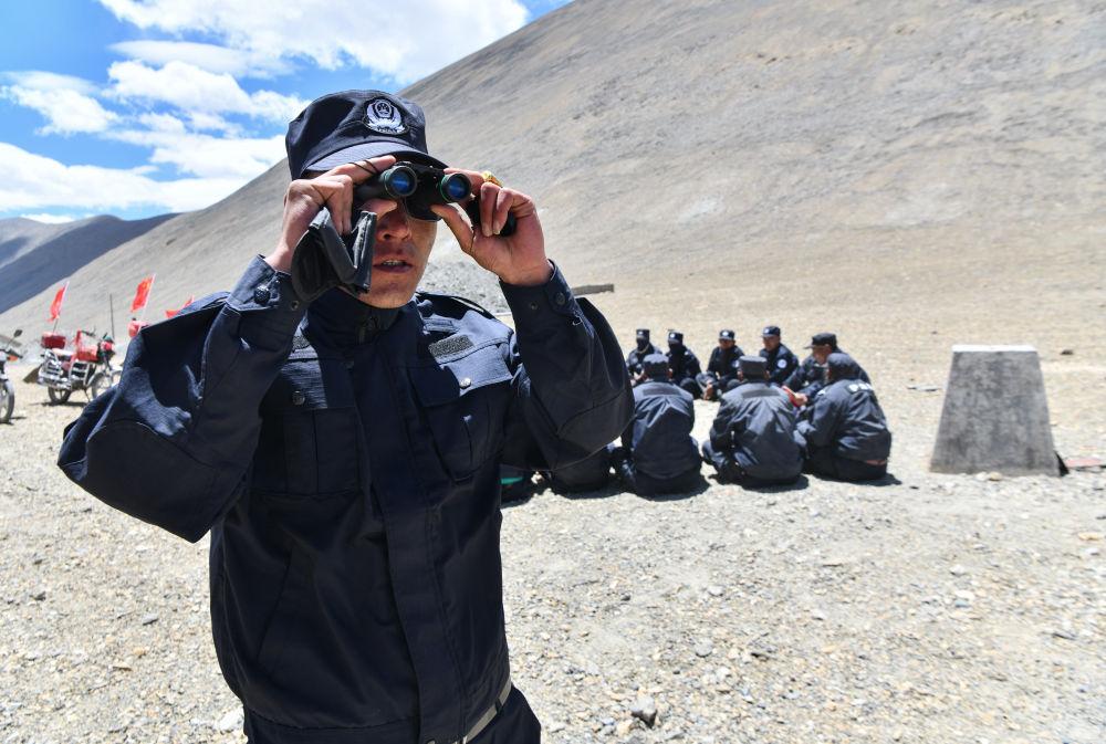 6月2日,在33号界桩处,一名护边联防队队员使用望远镜巡查。