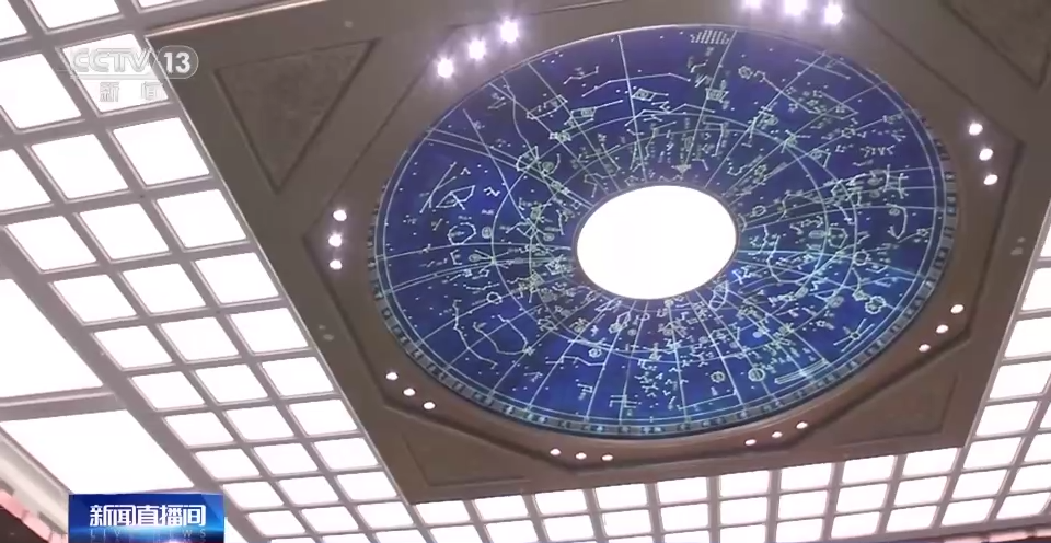 大厅顶部中央藻井内的星空穹顶,图案选用宋代石刻天文图。