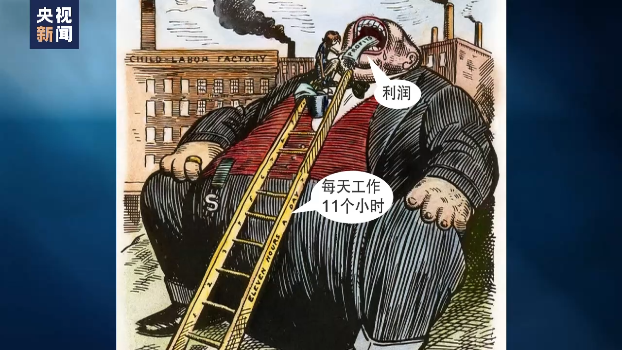 在这张漫画中,一名瘦削的童工一天工作11个小时,将利润送进贪婪的雇主口中,将他们养得脑满肠肥。