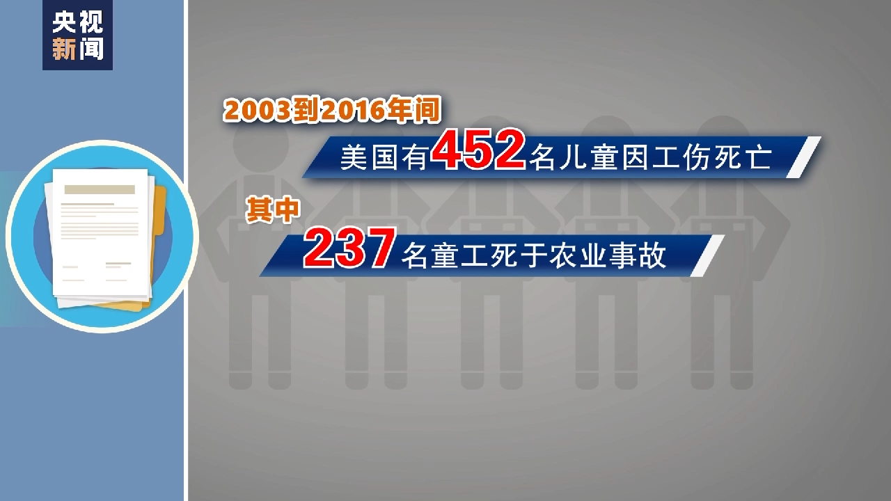 农业领域是美国雇佣童工的重灾区之一。据美国非营利组织“农场工人就业项目联合会”提供的数据,美国仍有50万至80万名童工在农场工作。农场劳作繁重、条件艰苦,童工还常被置于因天气、农药及使用农具农机所产生的危险中。《华盛顿邮报》报道,2003年至2016年间,美国有452名儿童因工伤死亡,其中237名童工死于农业事故。