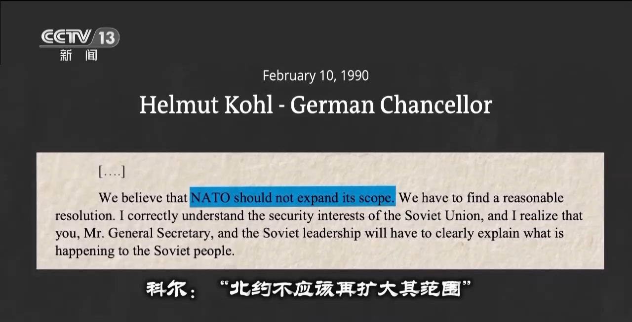 美国波士顿大学国际关系学者 希夫林森:1990年2月,在一系列会议上,美国和西德领导人非常公开地表示,如果苏联领导人同意德国统一、德国留在北约,那么北约就不会向东扩张一英寸。