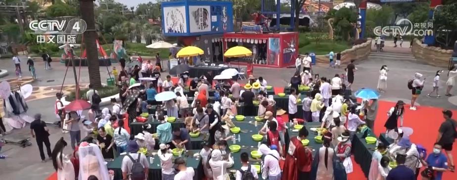 端午假日第二天,上海接待游客超324万人次,不少景点推出丰富多样的民俗活动,成为拉动旅游市场增长的新热点。海洋公园推出民俗体验活动,游客可以身着汉服,体验包粽子、点朱砂、斗鸡蛋、画团扇、投壶等传统民俗项目,现场国风感满满。