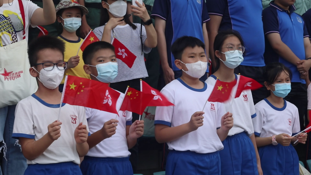 灯柱上悬挂的国旗、人们手中挥动的国旗、小朋友脸颊上贴着的国旗,处处飘扬着中国红、涌动着爱国情。我们同升一面旗、共唱一首歌,为迈向复兴的祖国点赞,为国安家好的香港加油!