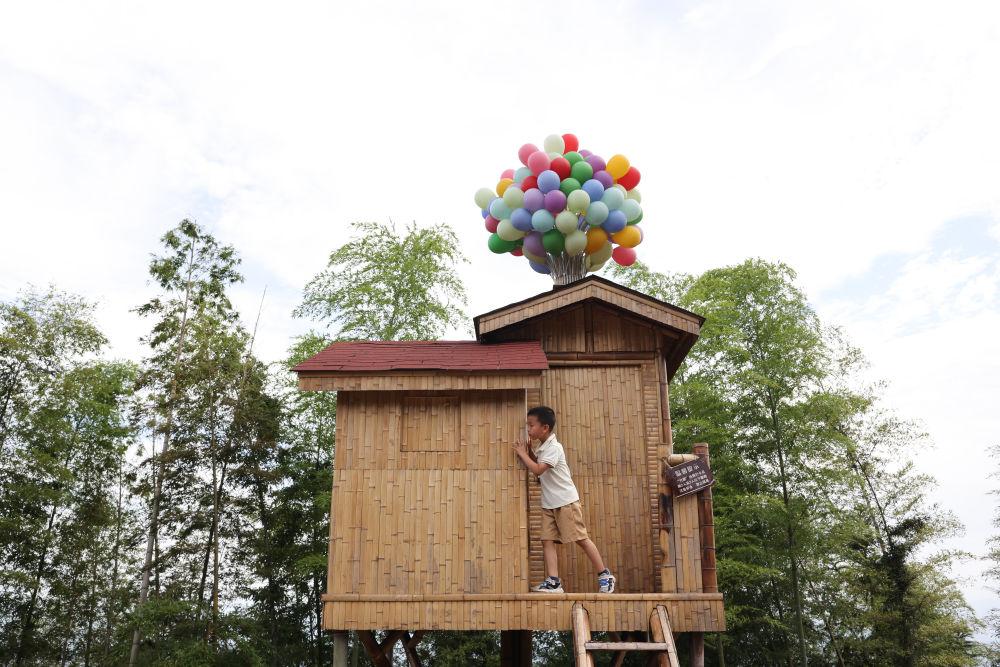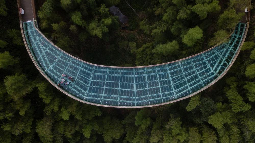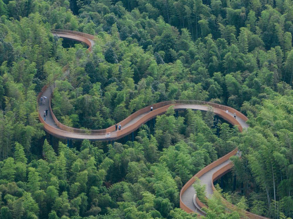 ↑游客在蜀南竹海的竹尖漫步步行走廊享受绿意。