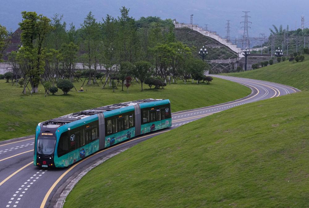 ↑一辆智轨电车行驶在宜宾市T1运营线上。
