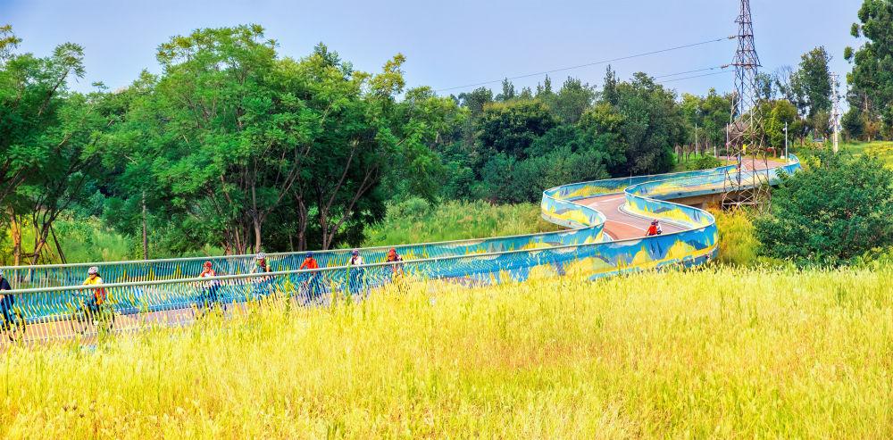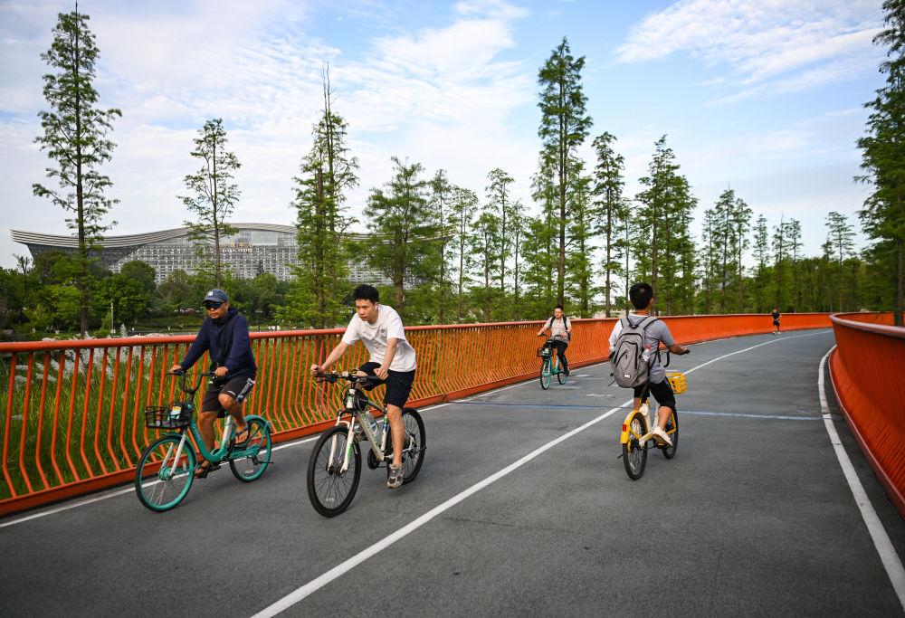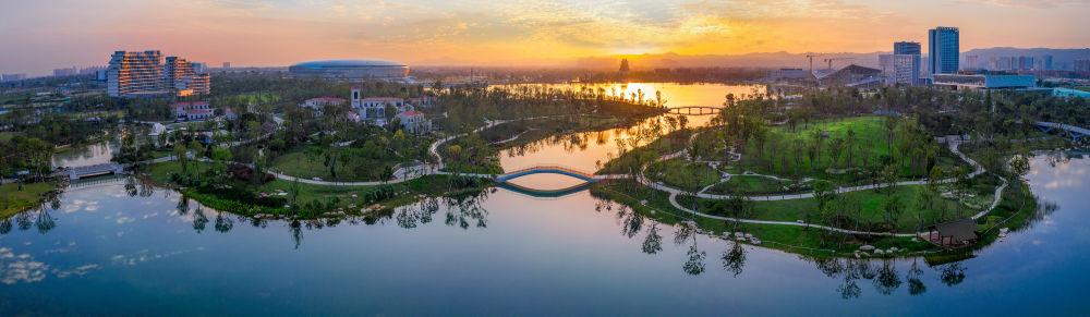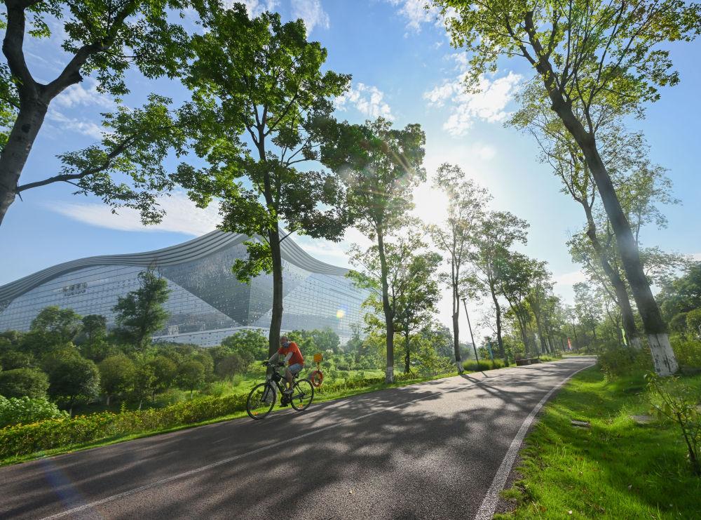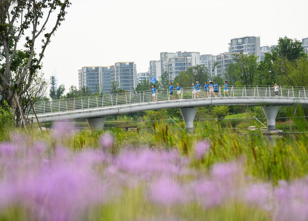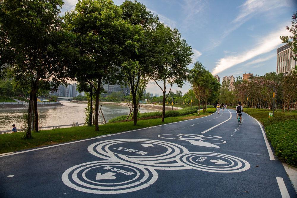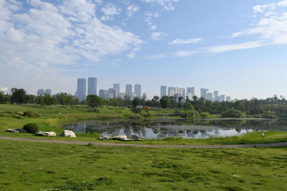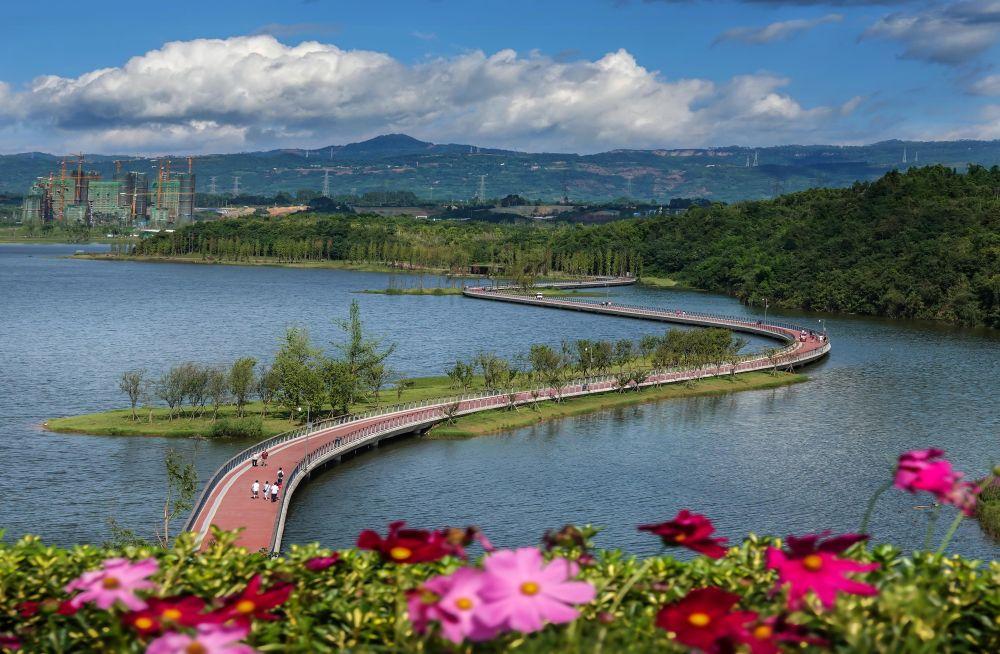 ↑成都市龙潭新区公园的湖水和环湖绿道。新华社发(艾加宪 摄)