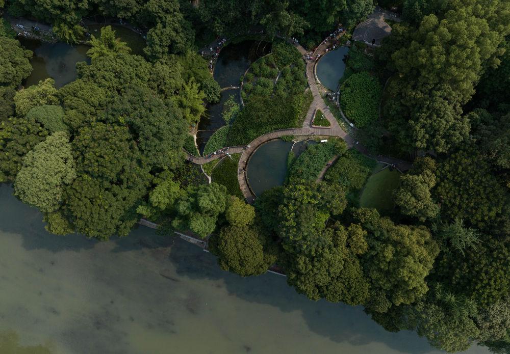 ↑俯瞰活水公园的人工湿地塘床生态系统。新华社记者江宏景摄
