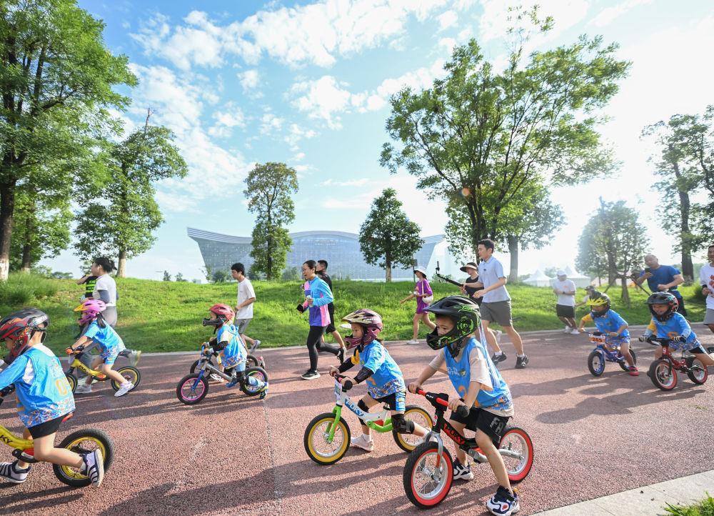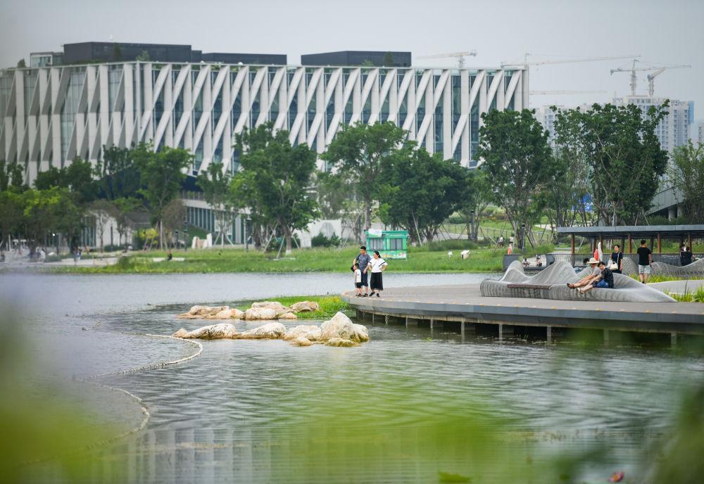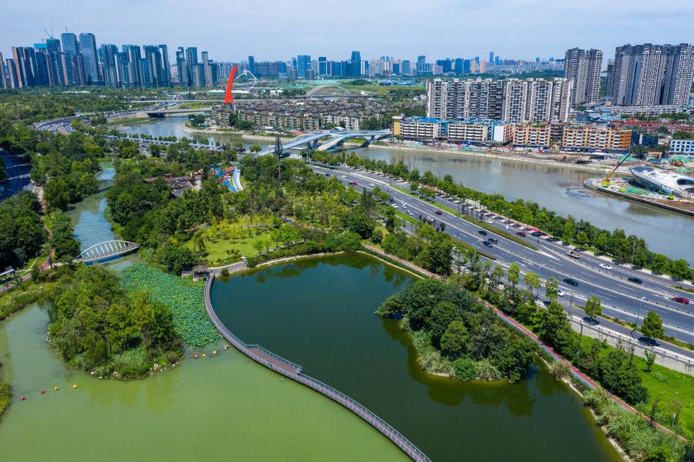 ↑流经中国西部博览城和西部(成都)科学城的鹿溪河。新华社记者 刘坤 摄