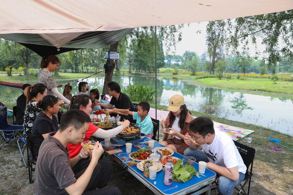 ↑余志朋(右一)在成都市郫都区三道堰徐堰河湿地公园里约着三家亲友休闲露营。新华社记者 江宏景 摄