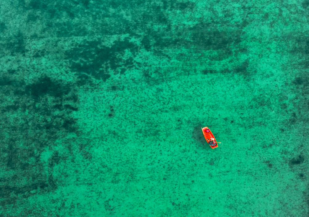 ↑环卫工人在成都北湖生态公园的北湖中清理水草(无人机拍摄)。新华社记者江宏景摄