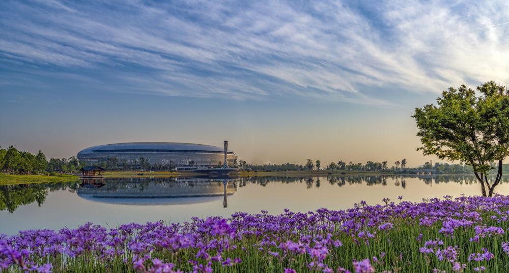 ↑这是成都东安湖体育公园内的大运会主体育场与远处的四姑娘山。新华社发(沈军摄)