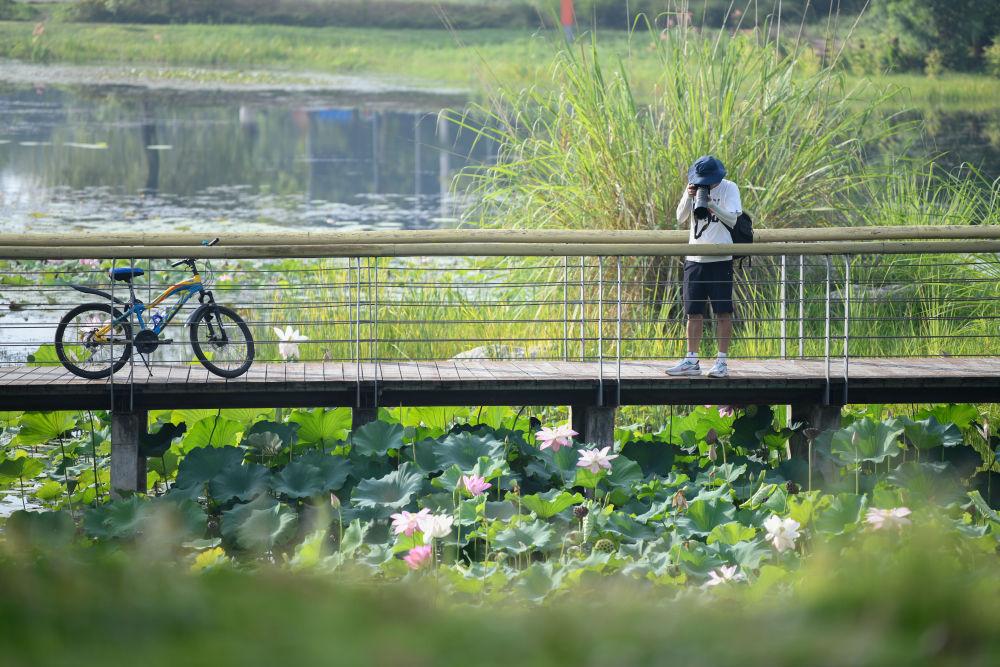 ↑游人在成都市兴隆湖休闲游览。新华社发(李学朴摄)