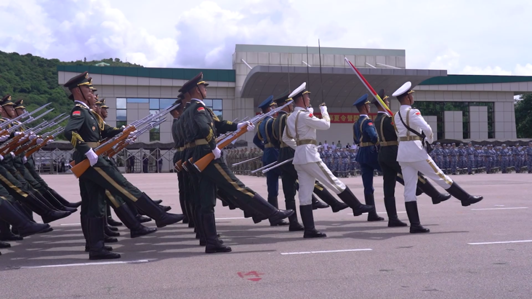 上午10时30分,驻香港部队三军仪仗队步履铿锵、昂首阔步护旗而出,在雄壮的国歌声中,五星红旗冉冉升起,青少年们庄严肃立,与解放军官兵一起高唱国歌。