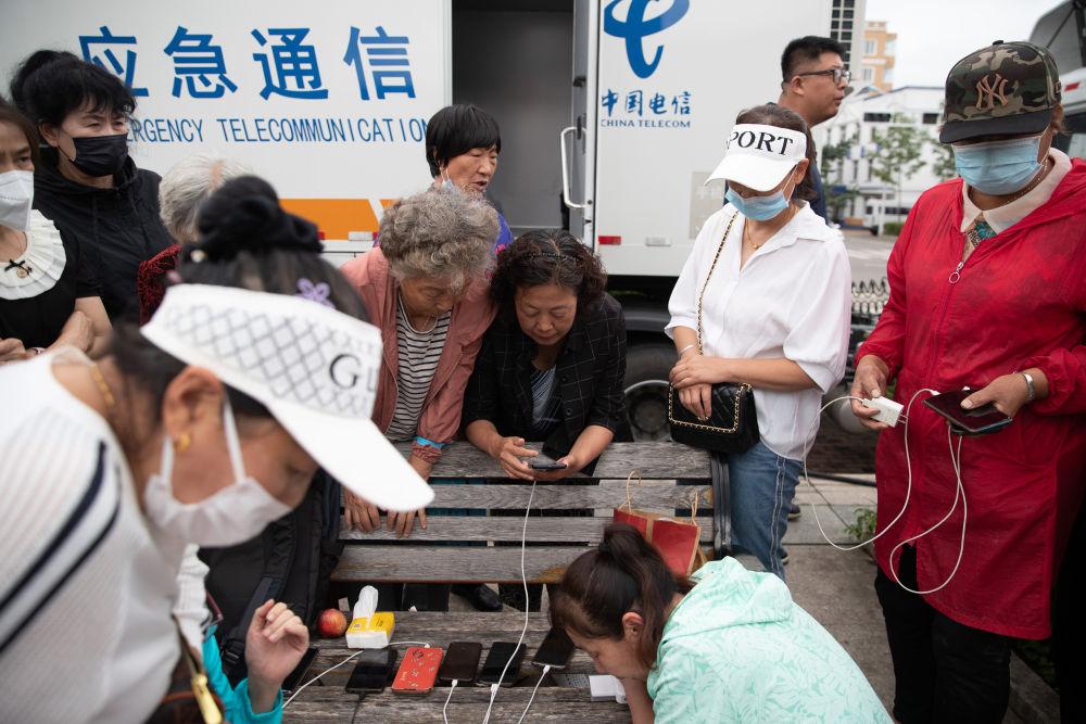8月6日,人们在黑龙江省海林市长汀镇一广场上的应急通信车前与外界通话。新华社记者 张涛 摄