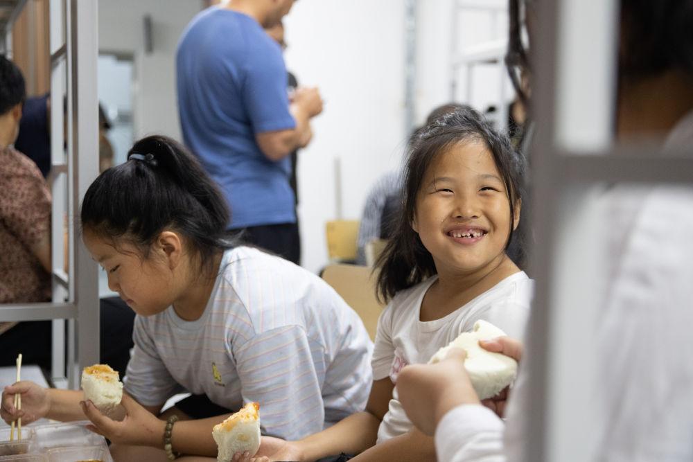 8月9日,人们在黑龙江省五常市时代中学集中安置点用餐。新华社记者 张涛 摄