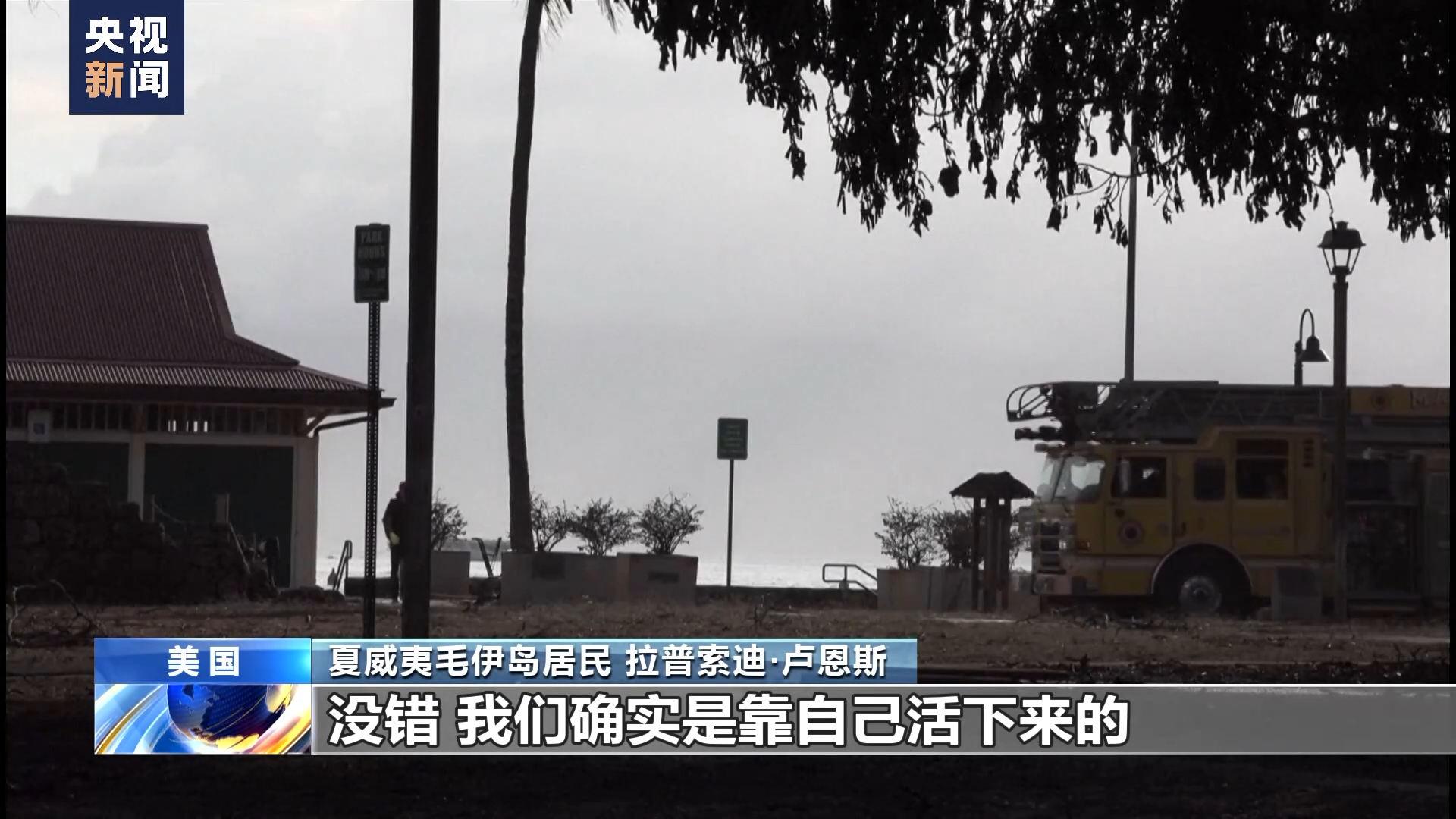 夏威夷毛伊岛居民 拉普索迪·卢恩斯:现在我们依然没有电,电信公司的服务已经停滞,我的手机上只有一格或两格信号,只可以给家人发短信或打电话。但现在,互联网断了,整个社区都停电了。我能说的是,政府不干涉,他们延缓了一切。政府是来到这里了,但是他们不接受外面的人来帮忙,他们关闭了港口,我们甚至不能去港口求救。联邦紧急事务管理局、红十字会在大火发生3天后才来。没错,我们确实是靠自己活下来的。